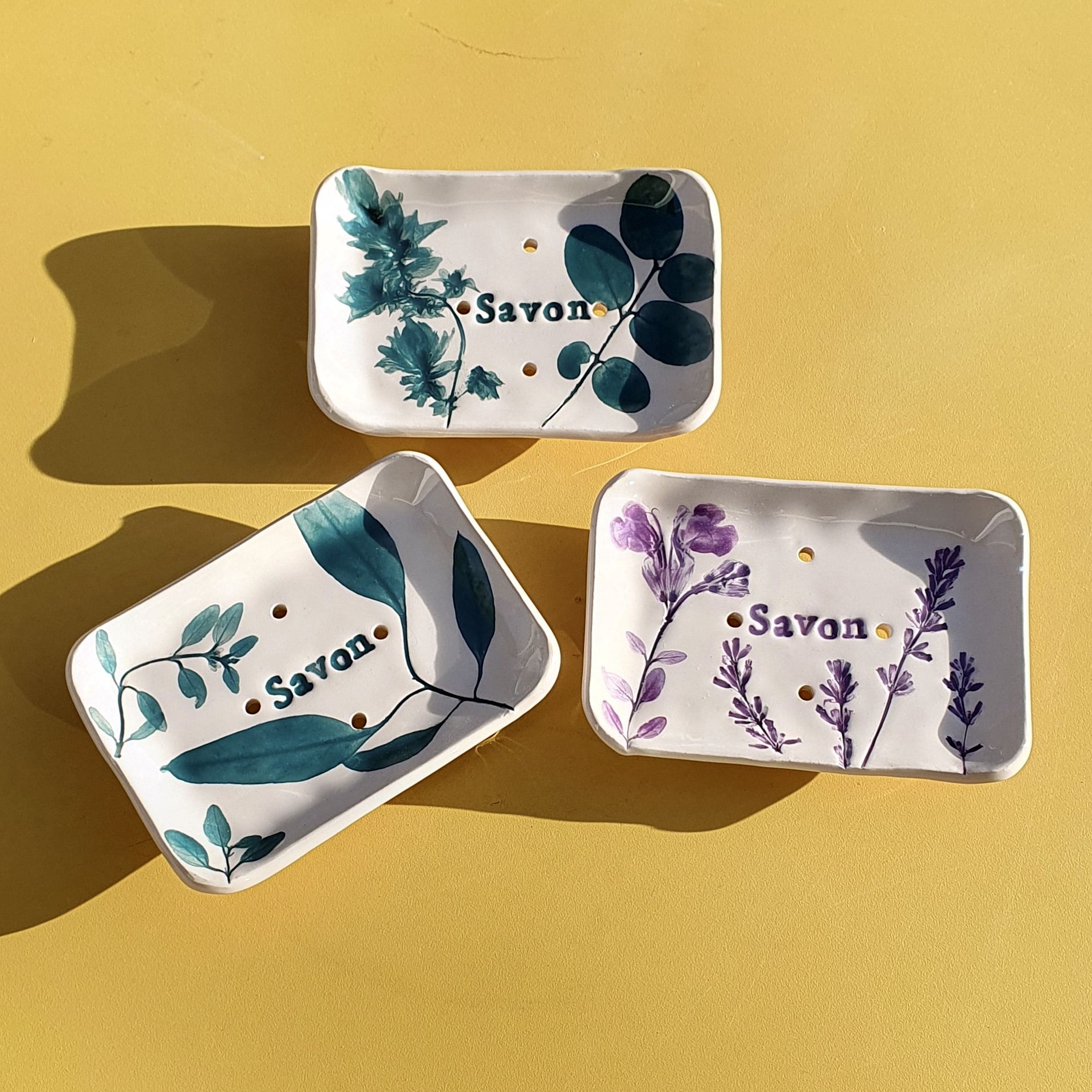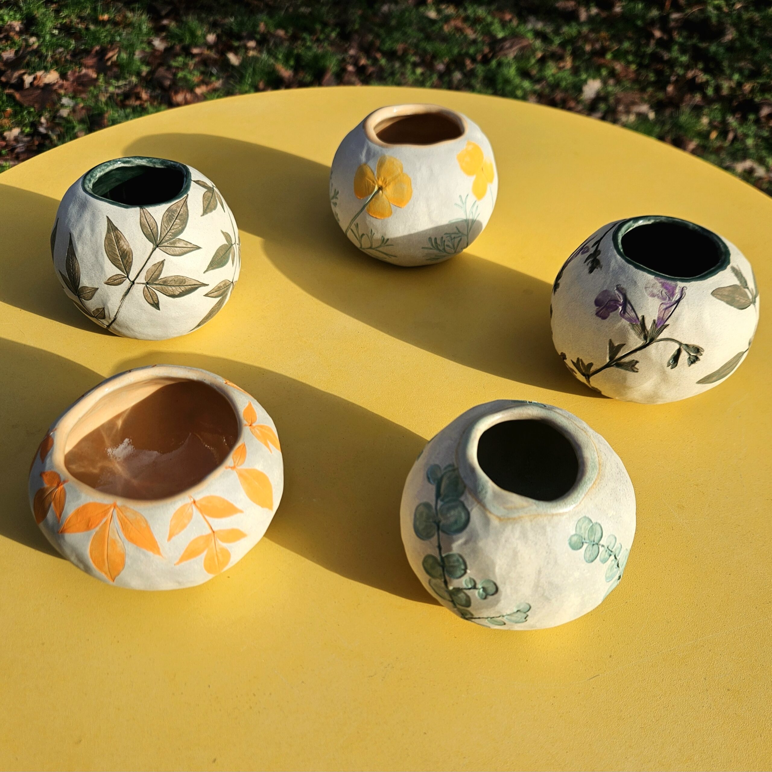 Laurence crée des objets en céramique artisanales dans son atelier à Coye-La-Forêt dans l’Oise. Elle crée des lignes d’objets au fil des saisons avec des végétaux imprimant leurs nervures à la surface de la terre. Impressions qu’elle vient ensuite révéler par les couleurs.