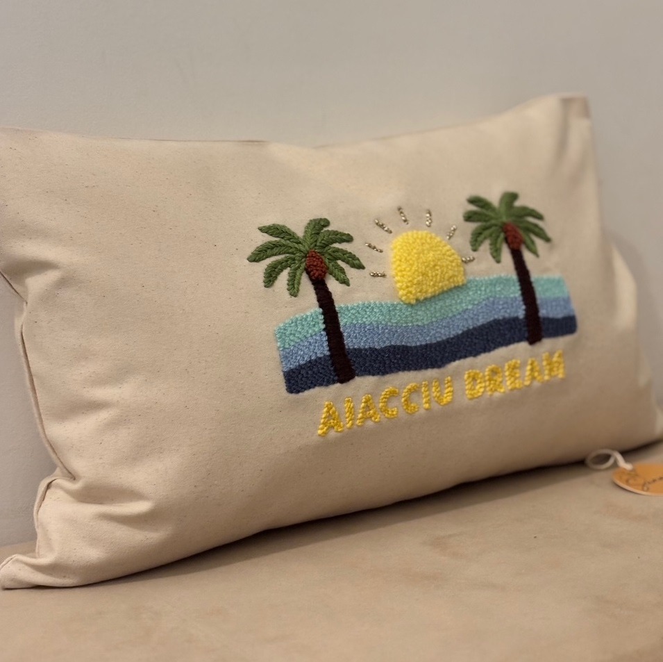 Sunnià est une marque artisanale ajaccienne dédiée à la création de pièces textiles. Chaque création est brodée à la main en punch needle, une technique de broderie en relief qui donne texture et caractère aux motifs. Une production en petite série, ancrée dans le savoir-faire local.